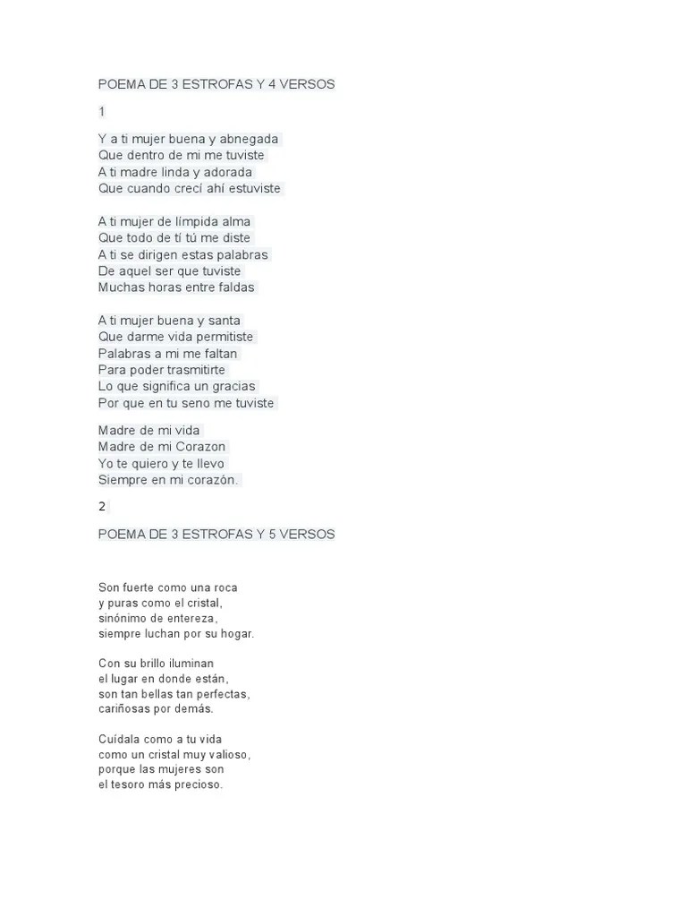Poemas De Tres Estrofas Y Cuatro Versos - Poema de 3 Estrofas y 4 Versos. Hay distintos tipos de estrofas según la cantidad de versos que tienen, la medida de los versos, el ritmo y la rima. Por otro lado, las coplas son estrofas de cuatro versos, que riman los versos segundo y cuarto con una rima de asonancia. Esto quiere decir que sus estrofas pueden carecer de rima y de métrica, por lo que toma más importancia el mensaje que el poeta quiere transmitir. Esto es muy notorio en las canciones y en los poemas de antaño, como los sonetos (compuestos por cuatro estrofas: Te vas al horizonte de las gaviotas, Denominada también tetrástrofo monorrimo, se compone de cuatro versos alejandrinos, es decir, de catorce … El soneto , una de las más difíciles formas clásicas, se compone de catorce versos, generalmente endecasílabos (once sílabas), divididos en dos cuartetos y dos tercetos (estrofas de cuatro y de tres versos), con distintas formas de … No hay una estructura fija para escribir poemas con metáforas.